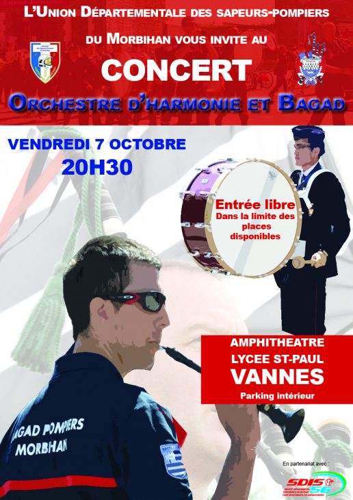 L’orchestre et le bagad des sapeurs-pompiers du Morbihan vous donnent rendez-vous le 7 octobre à 20h30, au lycée Saint-Paul de Vannes, pour un concert réunissant les deux associations musicales. ENTRÉE LIBRE, dans la limite des places disponibles. Pour plus de renseignements, contactez le 02 97 54 56 18